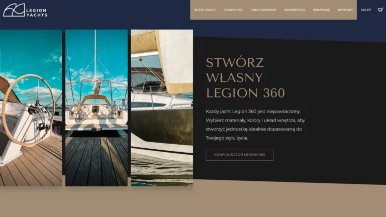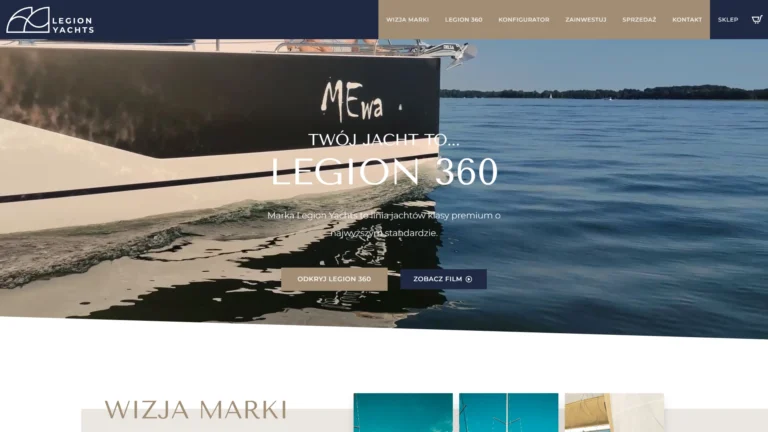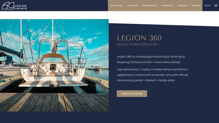 Legion Yachts to marka, która postawiła sobie za cel zrewolucjonizowanie świata żeglugi, a projekt ich nowoczesnej strony internetowej był kluczowym elementem tej misji. Stworzyliśmy elegancką, intuicyjną stronę, która w pełni odzwierciedla luksus i nowoczesność oferowanego produktu – Jachtu Legion 360. Dzięki nowej witrynie potencjalni klienci mogą w łatwy sposób zapoznać się z pełną ofertą marki, od szczegółowych opisów jachtów, przez przemyślaną galerię zdjęć, aż po sklep z akcesoriami żeglarskimi.
