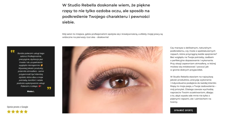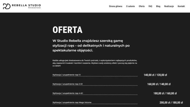 Strona Rebella to więcej niż tylko witryna – to narzędzie, które buduje relacje z klientkami, pozwalając na jasne przedstawienie oferty w nowoczesnej, estetycznej formie.